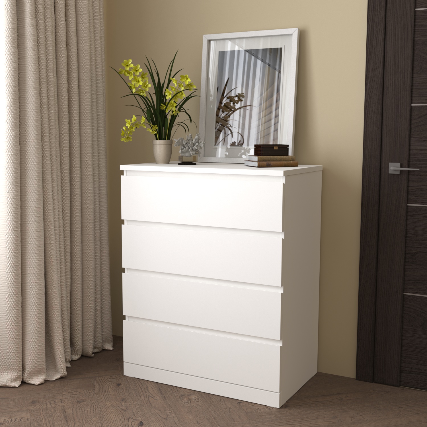 • Направляющие скрытого монтажа с доводчиками: Комод оснащен современными направляющими скрытого монтажа, которые обеспечивают плавное и бесшумное выдвижение ящиков. Доводчики гарантируют мягкое закрытие, предотвращая случайные удары и повреждения.